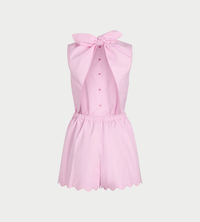 Primrose Pink organic cotton poplin playsuit. Round neck. Button front fastening. Open back with knot fastening at the top. Elasticated drawstring waist with tie fastening at the front. Pockets at the sides. Scalloped hem.