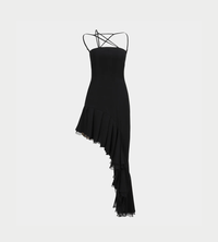 High low hem dress with exaggerated frill detail. Strategically placed thin straps, form a star pattern on the front when on the body.
