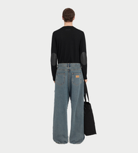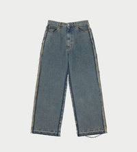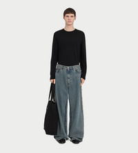 Cut with dramatic volume, these washed denim trousers feature exposed side seams and raw-edged insets in a tonal contrast. The style is finished with the MM6 signature white stitch line at the back.