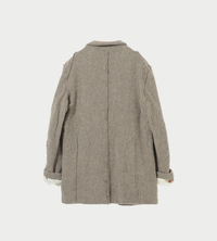 Single-breasted felted wool jacket with a notched lapel collar, two-button front closure, and exposed raw seams for a subtle deconstructed effect. Tailored silhouette with front flap pockets and full internal lining.