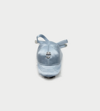 A miniature blue fabric hat reimagined as a sculptural hair accessory.