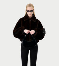 A Coperni staple reimagined in a soft faux fur. This brown bomber jacket delivers sculptural volume with a clean finish. Its stand collar, cocoon-like sleeves and subtly cinched waist create a strong, modern silhouette. It's a sleek outerwear choice, finished with a tonal logo patch on the arm for the utilitarian edge.