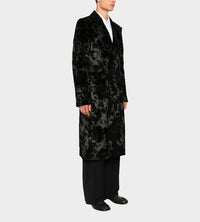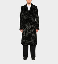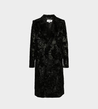 black patterned-jacquard faux sterling coat. Signature number motif at the cuff. Wide peak lapels. Shoulder pads, long sleeves with burned cuffs, two front flap pockets, central rear vent, concealed double-breasted button fastening, and internal jetted pockets.