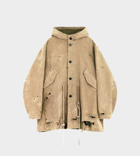 Distressed cotton canvas parka style jacket with dark brown button front closure and 2 flap pockets for hands. Drawstring at waist to cinch the jacket tighter, and hood lined with faux shearling material.