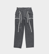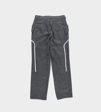 Soft textured wool, tapered pants with 1 pleat in front, and 2 draped pockets for hands. Draped pockets are piped with white trim purposely extended dramatic effect.