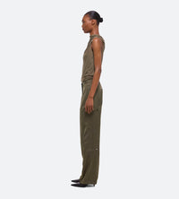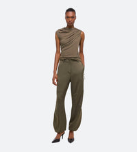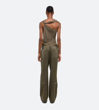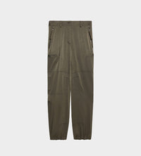 Mid-rise utility pants in crepe-backed satin. Inspired by the tactical details of aviation flight suits, with articulated knees and zip pockets throughout. Cinch the bungee cords at the ankle for a parachute fit.