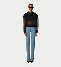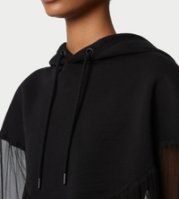 This black hoodie, a classic from the Nina Ricci collections, is reimagined by Harris Reed for this season. It blends the softness of jersey with the lightness of sheer chiffon, creating a striking contrast of textures. This layered effect adds a contemporary and sophisticated touch to this casual piece.