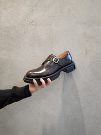 Limited edition collaboration with Second Layer. The gao creeper gets a unique update with distressed wine red leather and signature chunky sole. This monk strap closure shoe has a soft padded insole for additional comfort.