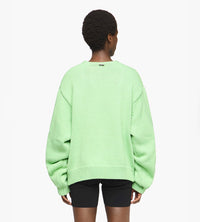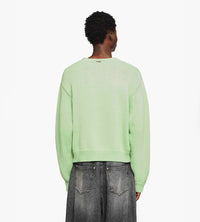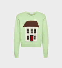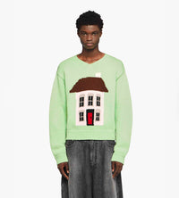 The mint color jumper is an oversized wool blend knit featuring a bold greenhouse graphic. With a relaxed fit and ribbed cuffs, it combines comfort and artistic design for a unique, eye-catching look.