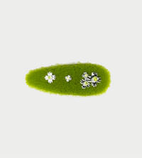 A soft grass-like hair clip rendered in vivid green, accented with delicate crystal flowers scattered across the surface. The textured fabric base introduces depth and tactility, evoking the quiet softness of natural ground cover.