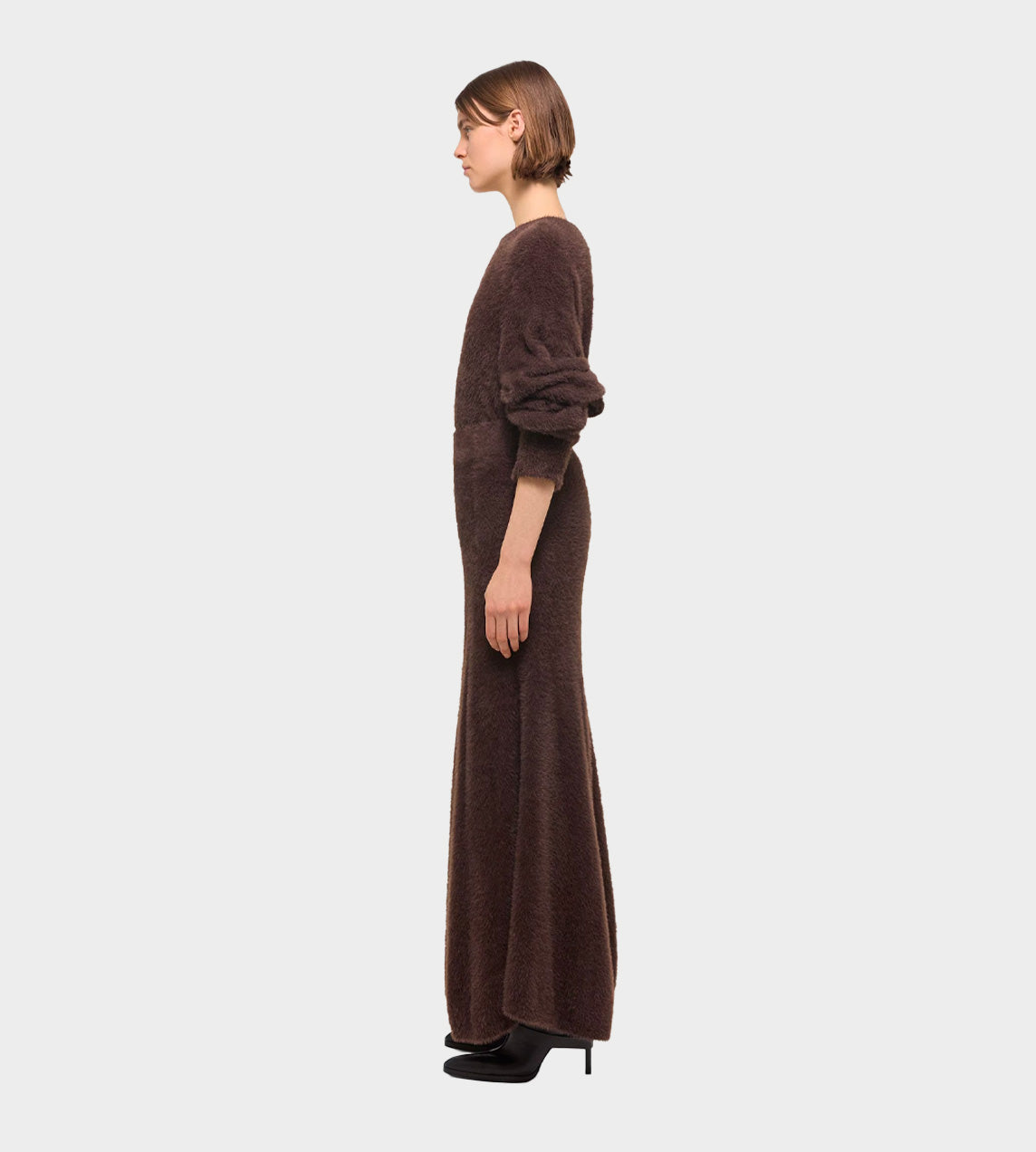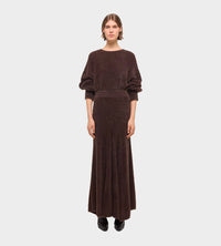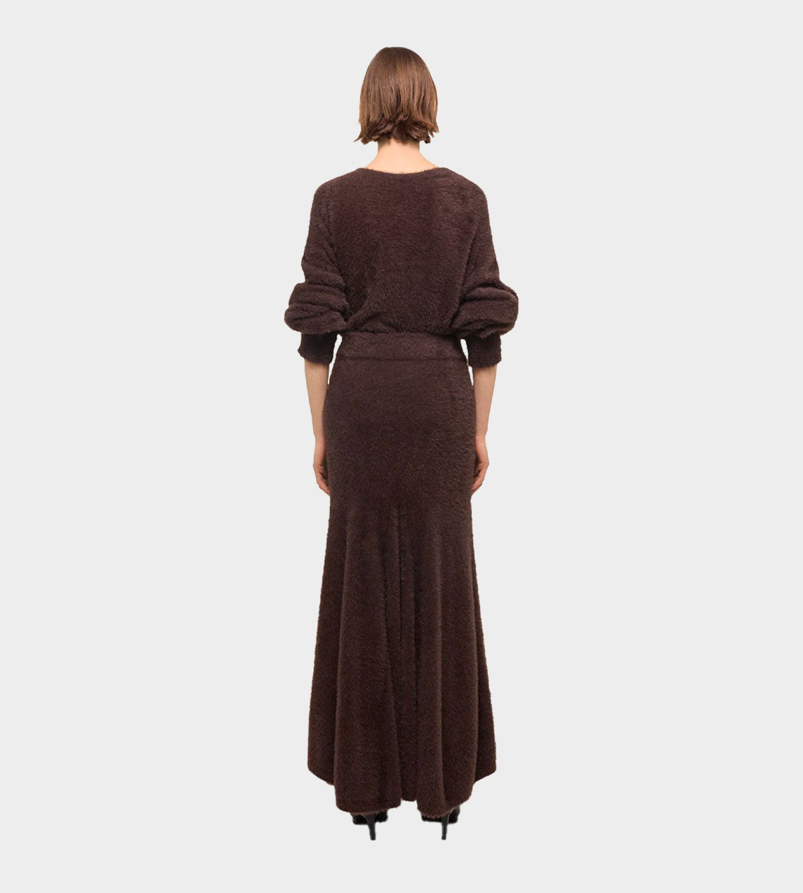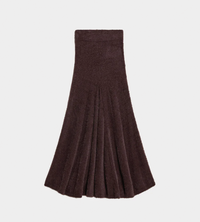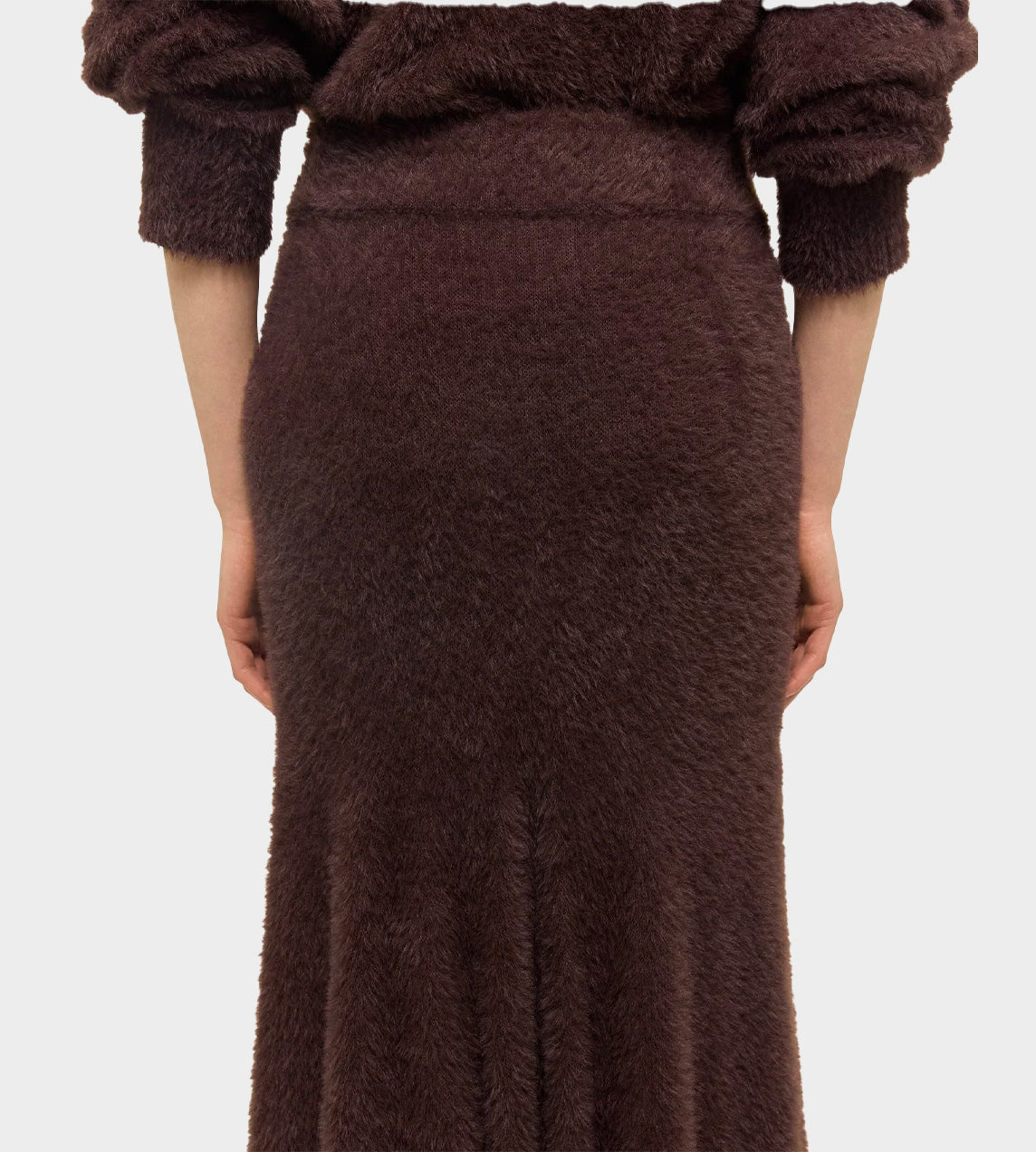 Full-length skirt made in a feathery eyelash knit. Gusset details add more volume, creating a dynamic shape.