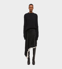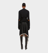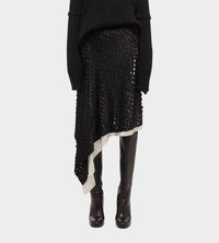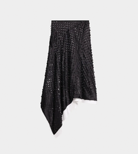 Asymmetrical layered skirt in glossy satin, laser-cut with a hole-punch texture that reveals the white lining beneath as it moves. Cut on the bias for a fluid drape and finished