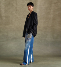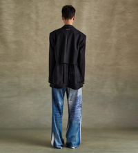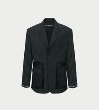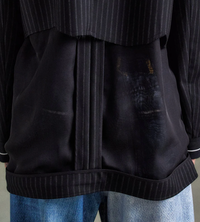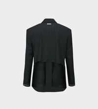 Notched Lapel Three-Button Standard Silhouette. Pinstripe Fabric, Mesh Fabric. Inside-Out Design with Panel. Raw-Cut Detailing. Andersson Bell engraved button detail.
