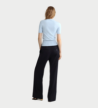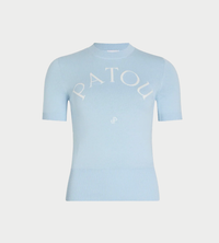 Skylight Blue cotton blend top. Round neck. Ribbed collar, cuffs and hem. Short sleeves. Patou logo and JP monogram jacquard at the front.