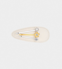Jewelry box hair clip in white color. 100 calf leather with a pouch that contains 3 different styles of hair pins. Hear pins can be removed and wear separately. Clip fastening. Yvmin Paradise collection.