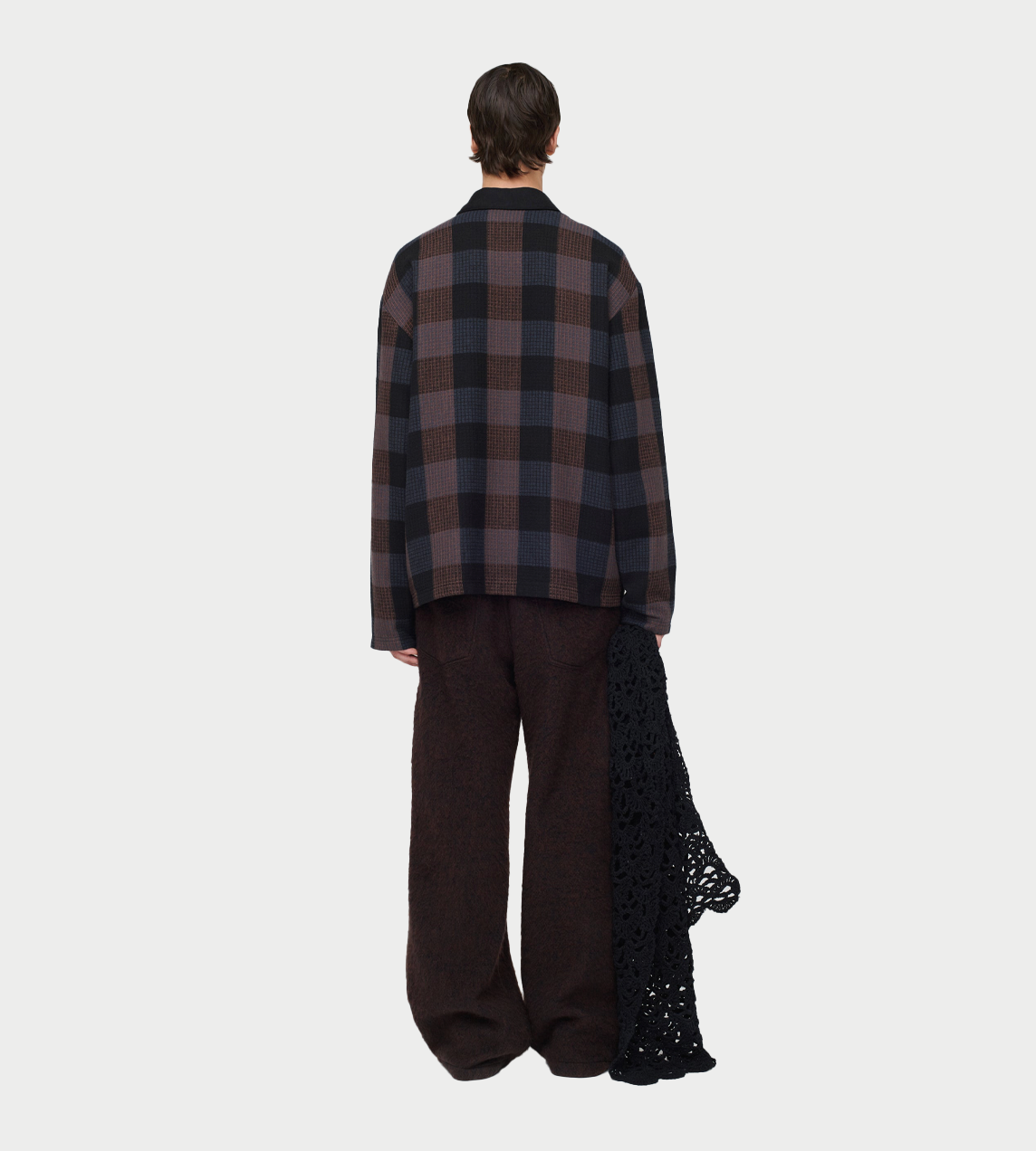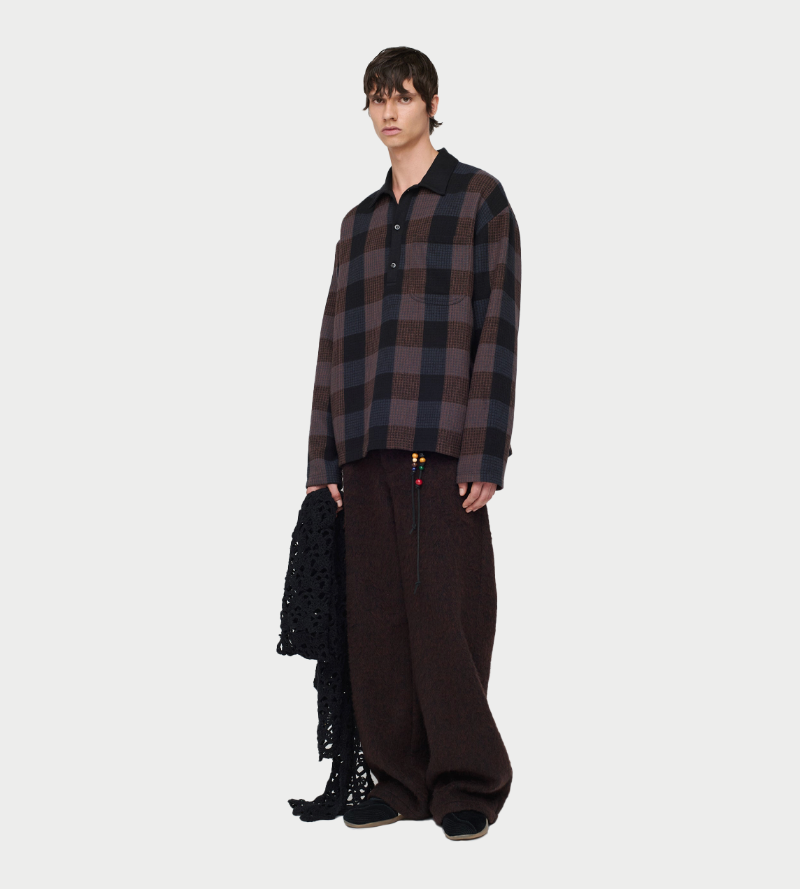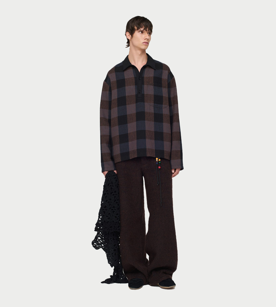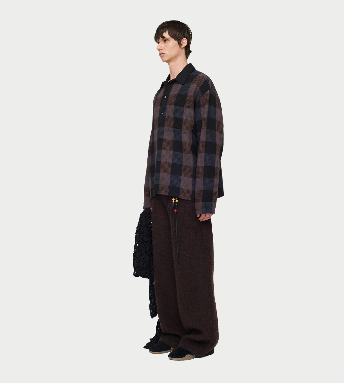 New to 25.2 ‘Sunflower’, the Long Sleeve Polo is constructed from a woven Japanese purple and black check, offering both structure and softness. A contrast beige ribbed collar and