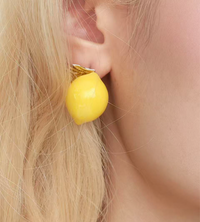A sculptural lemon form reimagined as a bold stud earring. The glossy yellow surface captures light with a smooth, rounded finish, while subtle metal detailing at the top references the fruit’s natural stem.
