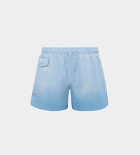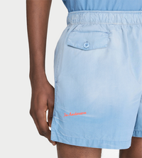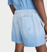 Cotton poplin shorts with garment dyed effect. Elasticated waistband. Internal flat drawstring. Buttoned flap pocket. Back patch pocket. Red seasonal logo embroidery at the hem. Contrast anchor print on back pocket. Relaxed fit - take your usual size