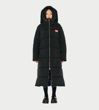 Hop into the cooler months with our signature Rabbit Ears Puffer, now in a longer silhouette. Crafted in a sleek black nylon twill, this staple is given the LOVERBOY twist with the cutest bunny ears dangling from its hood.