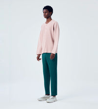 Henley neck top in bright colors. It dries easily, which is unique to polyester material, and is characterized by portability and light comfort. Horizontal pleats on the sleeves create a