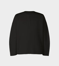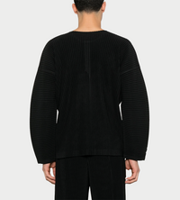 Henley neck top in black color. It dries easily, which is unique to polyester material, and is characterized by portability and light comfort. Horizontal pleats on the sleeves create a rounded and soft impression.