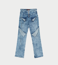 The design features a relaxed, straight-leg silhouette with a visible zip fly, belt loops, and strap details at the waistband. Distinctive folded panels at the knees add an element of deconstruction, while fading and whiskering throughout the fabric enhance the worn-in aesthetic. Four-pocket styling and a logo patch at the back waistband complete the look.