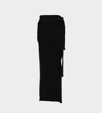 The Ottolinger Lounge Drape Skirt in Black offers a contemporary take on classic tailoring. Crafted from a soft, knit viscose-blend fabric, this skirt features raw edges throughout, adding a deconstructed touch to its minimalist design. The draped and asymmetrical construction creates a dynamic silhouette, while the extended trim at the side seams and gathering at the back enhance its sculptural form. This skirt combines comfort with avant-garde aesthetics, making it a versatile piece for both casual and formal occasions.