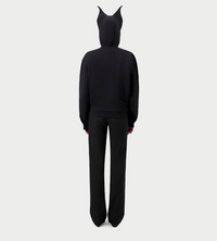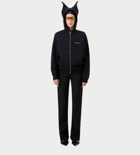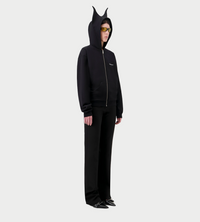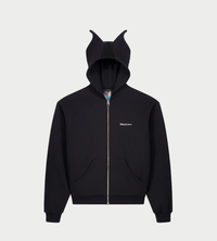 The standout feature is its hood, sculpted with exaggerated curved horns, adding a playful yet edgy touch. The hoodie also features a zip closure, kangaroo pockets, ribbed cuffs and hem, and a logo embroidered at the chest, all contributing to its modern aesthetic.