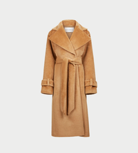 This long wrap coat in dark tobacco is crafted from a soft blend of brushed alpaca and virgin wool. Defined by clean lines and structured elegance, it features a wide collar and cuffed sleeves that highlight its couture spirit. Designed for a modern and feminine silhouette.