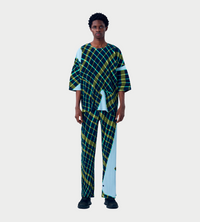 Windswept plaid short sleeve tee. This round-neck, short-sleeved top has an impressive pattern composed by capturing the moment when the plaid-patterned fabric flutters in the wind. It expresses the fun, wonder, and spontaneity of the plaid pattern being naturally distorted by the force of the wind.