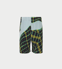 Windswept plaid shorts. These shorts have an impressive pattern composed by capturing the moment when the plaid-patterned fabric flutters in the wind. They express the fun, wonder, and spontaneity of the plaid pattern being naturally distorted by the force of the wind. They have pockets on both sides and an inner draw cord. They have a button-fly design.