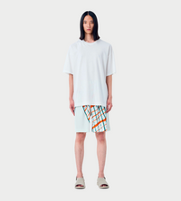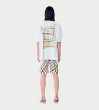 Windswept plaid t-shirt. This round-neck, short-sleeved top has a silkscreen print that depicts the moment when the plaid-patterned fabric flutters in the wind.