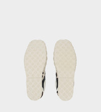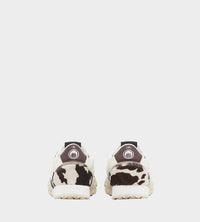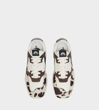 Low-top nappa leather, suede, and hair-on leather metal free MS rise sneakers in brown and off-white. Lace-up closure, logo patch at