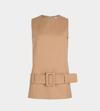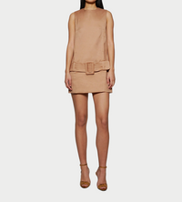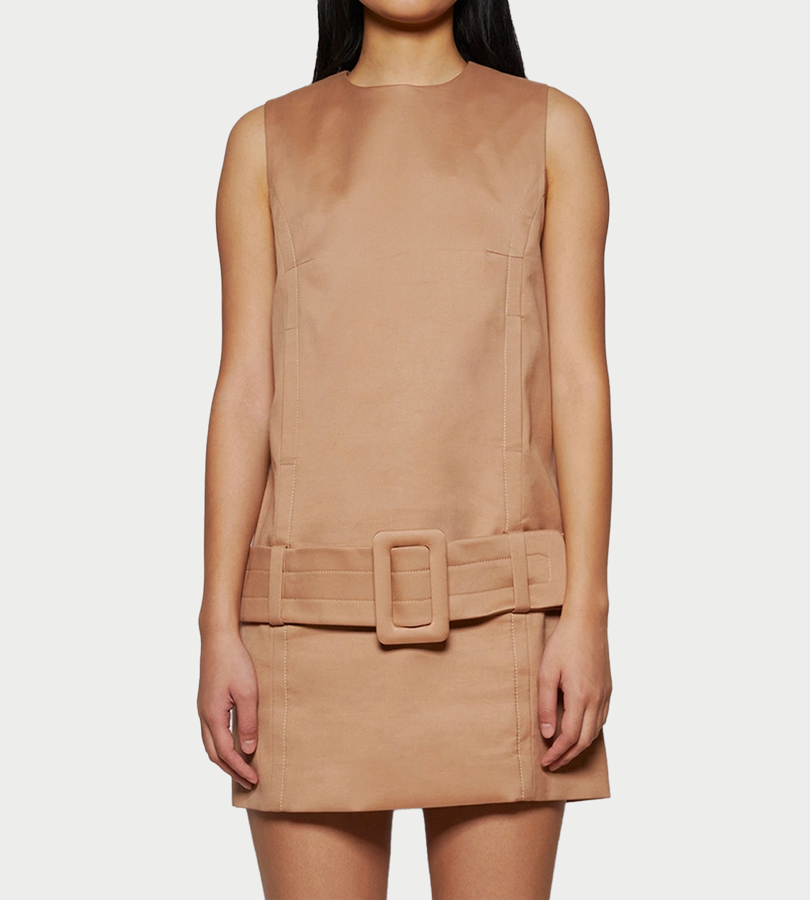 Praline beige organic cotton twill dress. Mini length. Straight silhouette. Round neckline with zip fastening at the back. Sleeveless. Wide fabric belt designed to sit on the hips. High seam pockets at the front. Lined.