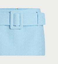 Skylight Blue lightweight organic cotton tweed skirt. Mini length. Straight silhouette. Wide fabric belt designed to sit on the hips. High seam pockets at the front. Lined.