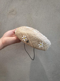 Pillbox style straw hat with daisy stub appliques, and elastic strap.