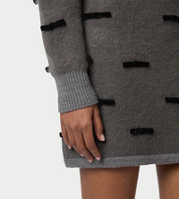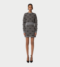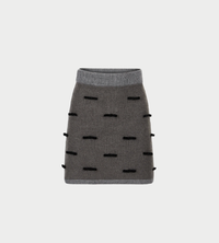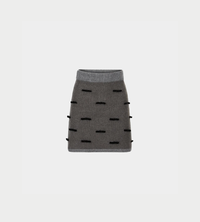 This heathered grey mini skirt in mohair knit blends softness and warmth. Crafted from a double-faced knit, it combines a mohair exterior with a wool interior for a cozy, enveloping feel. Tone-on-tone bows are delicately hand-applied across the piece, adding texture and structure. The ribbed elastic waistband lends a sporty finish while sculpting the silhouette. Worn with the matching sweater, it completes a full Nina Ricci look.