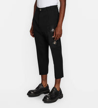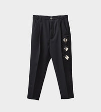 Single pleated, straight leg trouser in a thick wool gabardine featuring a geometric mirror applique on the leg. Structured waistband with belt loops and button fly, side pockets with coin pocket, and back welt pockets.