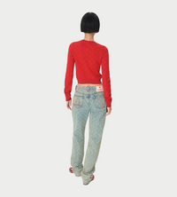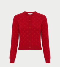 Fitted adjusted length cardigan with a crewneck and long sleeves. Signature Moon jacquard all over. Ribbed neckline, cuffs, and hem. Six button front with ribbed button tab. Branded buttons.