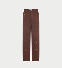 Relaxed fit medium waisted twill workwear pants in deep brown color. Buttoned front. Belt loops. Cowboy paneled construction. Signature Moon jacquard twill on hips and back hem. Branded leather patch on back waistband. Logo engraved on button.