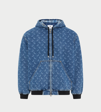 Denim jacket with all-over moon embroidery, worn-in canvas texture, and a structured silhouette. Zip-front closure with signature moon-crescent pull, kangaroo pockets, and ribbed cuffs and hem. Tartan dead-stock lining adds an unexpected contrast.