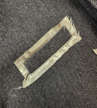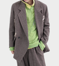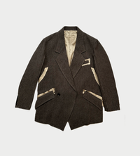 Vintage inspired textured wool blend jacket with button front closure. Signature beige pocket outline patches on front pockets with raw edges. Asymmetric hem with long slit at back.