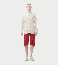 This high-neck jacket is characterized by its unique silhouette inspired by the way a pocket expands when a stone is placed inside. When items are placed in the pockets, the pleats expand, which changes the silhouette. The jacket has pockets on both sides.