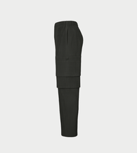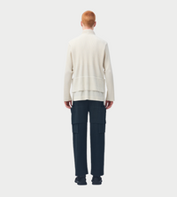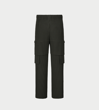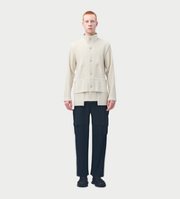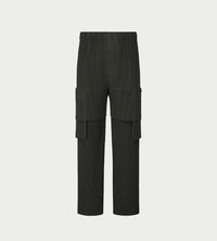 These straight pants are characterized by their unique silhouette inspired by the way a pocket expands when a stone is placed inside. When items are placed in the pockets, the pleats expand, which changes the silhouette. The pants have pockets on both sides and a draw cord at the waist. They have a button-fly design.