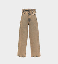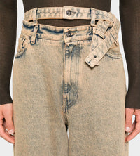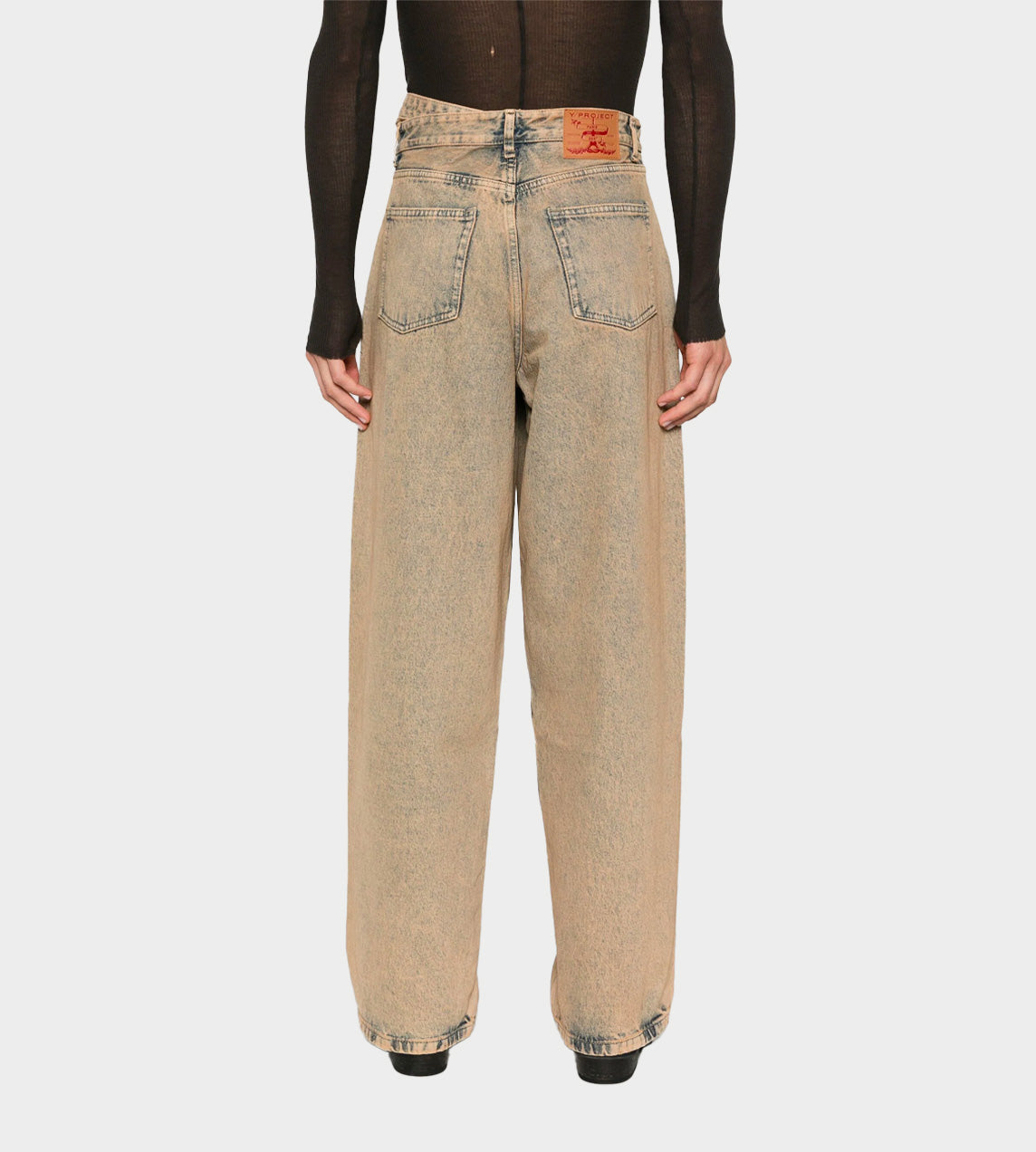 Y/PROJECT vintage beige jeans, multi-waist design, non-stretch denim, washed treatment, mid-waist, belt loops, button & zip-fly, five pockets, back branded jacron leather patch, denim topstitching, wide leg, regular fit, gender-neutral.