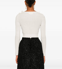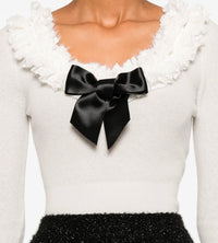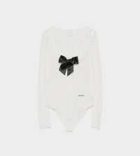 Knit wool and cashmere-blend neck-embellished bodysuit. Lace trim and bow at scoop neck. Elasticized bottom with press-stud fastening. Buttoned cuffs. Logo embroidered at waist