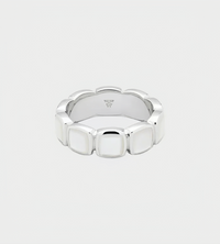 The Cushion Band White MOP is an exclusive band ring with custom hand cut and bezel set White Mother of Pearl all around the band to form the signature