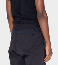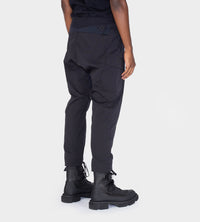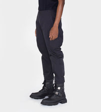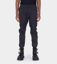Snap closure, slim leg cargo pant with elastic cuff detail. 2 integrated slim cargo pockets, with slanted slash pockets for hands. 2 invisible zipper back pockets, and drawstring waist.
