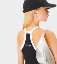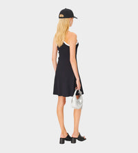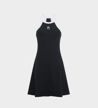 Organic cotton, ribbed tank dress with contrasted white ribbed shoulder strap and trim. Contrasted white circle Moon logo embroidery placed below the strap in the center front.