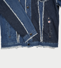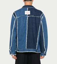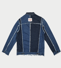 Charles Jeffrey LOVERBOY x Clash of Clans collaboration. Two-tone denim patchwork blue soft touch jacket. Relaxed fit. Featuring a special edition LOVERBOY patch logo on the back.